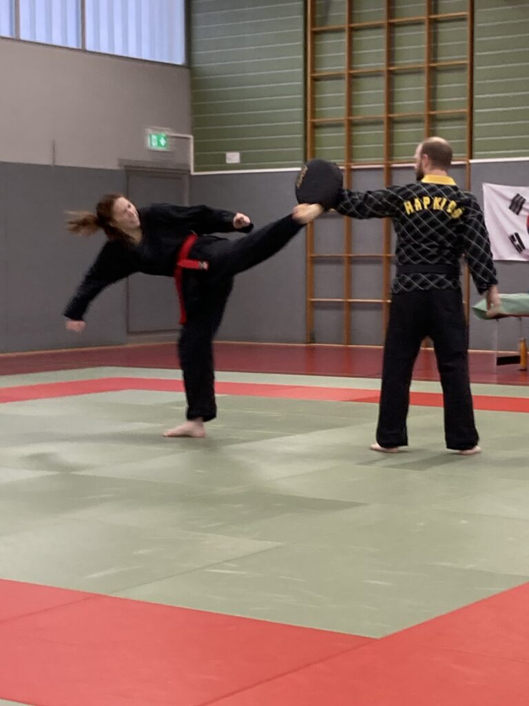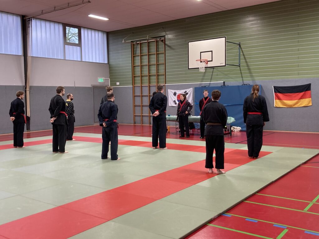 Nach der Hauptprüfung wurden dann gesprungene Fußtritte, Messerabwehrtechniken, Schläge und Blöcke mit dem Kurzstock und Spezialkreistechniken gezeigt, welche die Prinzipien vom Hapkido nochmal verdeutlichen. Im Anschluss wurde eine Fußtechnikform gezeigt und sich in zwei Disziplinen gegen mehrere Angreifer verteidigt.