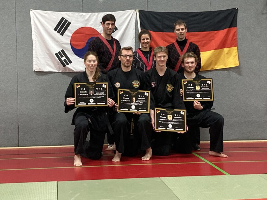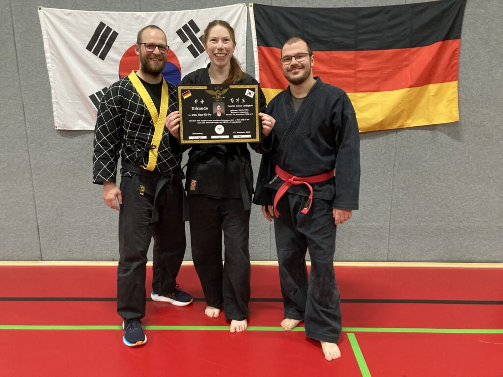 Nach gut 6 Stunden Prüfung durften alle Prüflinge wohl verdient ihren Schwarzgurt samt Urkunde in Empfang nehmen. Carolin Grahn Leidigkeit ist damit die erste Danträgerin der Hapkido Abteilung vom TV Attendorn.